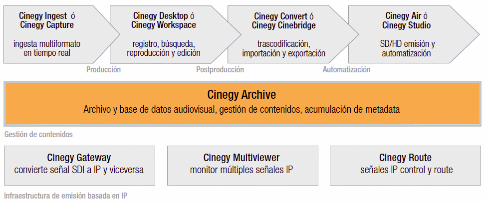 Remplazar el legado de la infraestructura basada en SDI por infraestructura Ethernet IP se ha convertido en una de las opciones más populares de los canales de televisión que buscan mejorar su eficiencia y reducir costes. La infraestructura IP permite transportar datos de vídeo en redes Ethernet en vez de utilizar switches y cables SDI, ofreciendo numerosas ventajas a los difusores de televisión. La infraestructura IP es más escalable y menos costosa de implementar y mantener. También ofrece una gran capacidad de señal y mayor flexibilidad, permitiendo el crecimiento rápido de la infraestructura, siendo mucho más estable y presentando menos problemas. Las soluciones de distribución de señal y soluciones de IP de Cinegy incluyen:Cinegy Multiviewer, Cinegy Gateway y Cinegy Route.